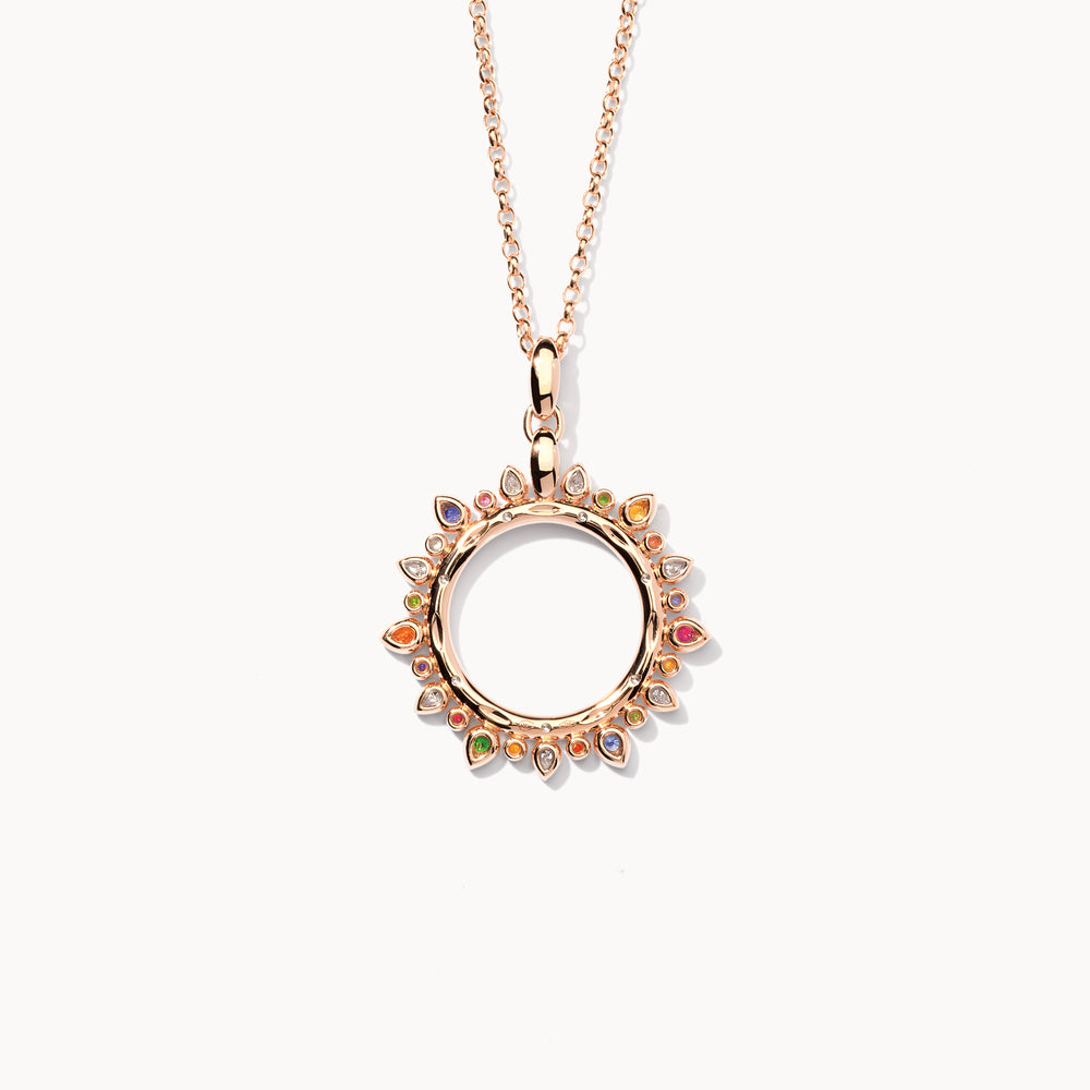 Vibrant and playful, the GYPSY Large Sun Pendant in the Color Story ‘Candy’ embodies pure joy. A dazzling rainbow of gemstones and shimmering Diamonds is artfully arranged in a radiant sun pendant in 18K gold, symbolizing warmth, happiness, and positivity. Lightweight and full of life, it shines effortlessly on a casual leather cord or a delicate gold chain.