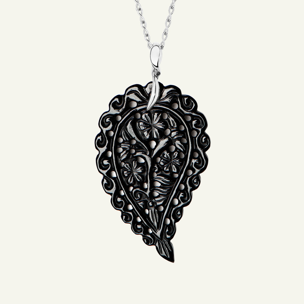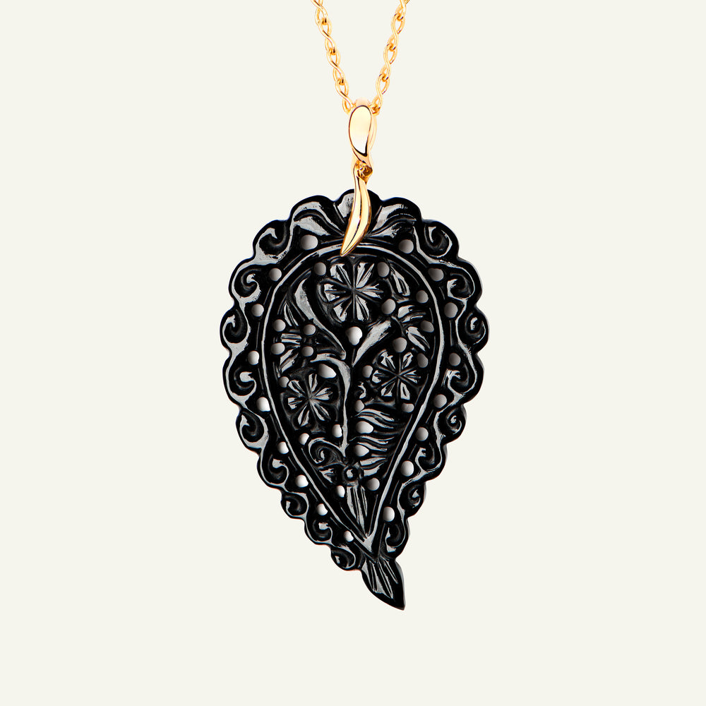 The INDIA Large Pendant in 18K gold features artfully carved black Onyx, showcasing deep, polished tones in an elegant leaf shape. Designed to dangle delicately from a chain, it’s a striking everyday favorite that adds a touch of sophistication to any look. Perfect for adding dimension to a layered style.