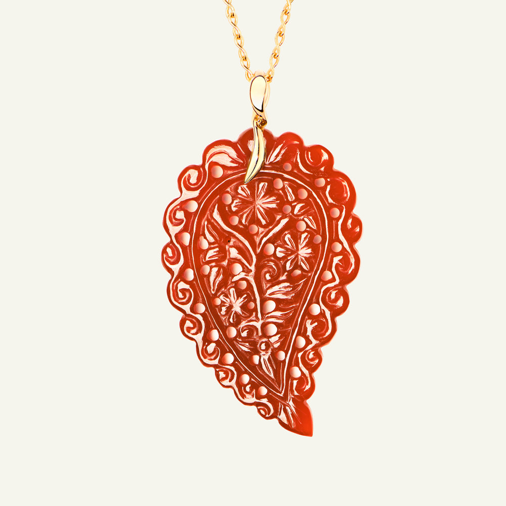 The INDIA Large Pendant in 18K gold features artfully carved Terra Onyx, showcasing warm, earthy brown tones in an elegant leaf shape. Designed to dangle delicately from a chain, it’s a beautiful everyday favorite that adds a touch of sophistication to any look. Perfect for adding dimension to a layered look.