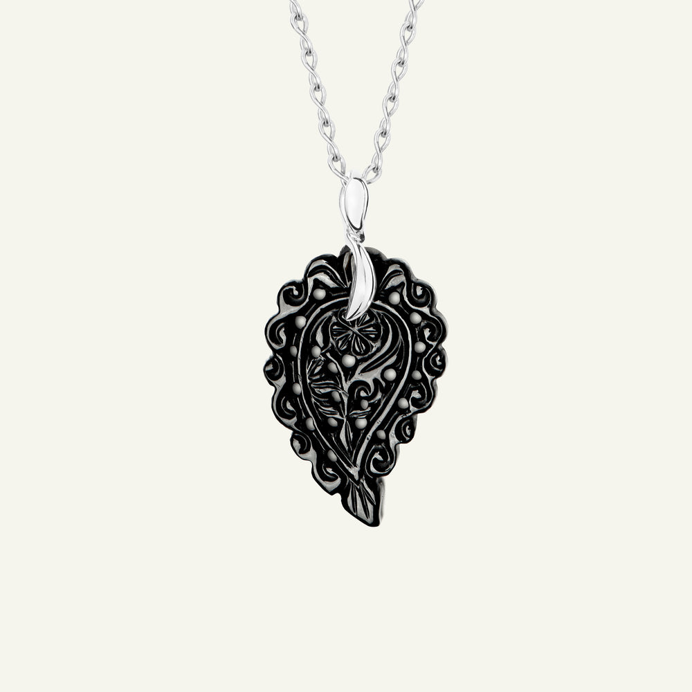 The INDIA Small Pendant in 18K gold features artfully carved black Onyx, showcasing deep, polished tones in an elegant leaf shape. Designed to dangle delicately from a chain, it’s a striking everyday favorite that adds a touch of sophistication to any look. Perfect for adding dimension to a layered style.