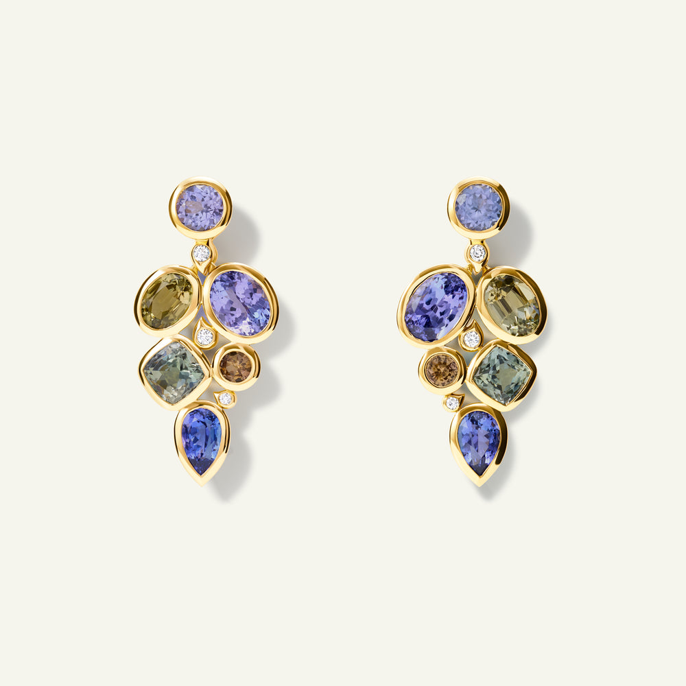 Designed for and inspired by the wife of TAMARA COMOLLI’s owner, the JULIA Earrings feature clusters of rich blue and tonal ‘fancy’ colored Tanzanites on a chandelier style. Once considered a throwaway gemstone, Tanzanites are now rare and highly coveted, sourced from the foothills of Mt. Kilimanjaro. The result is a head-turning, contemporary design made for truly special moments.