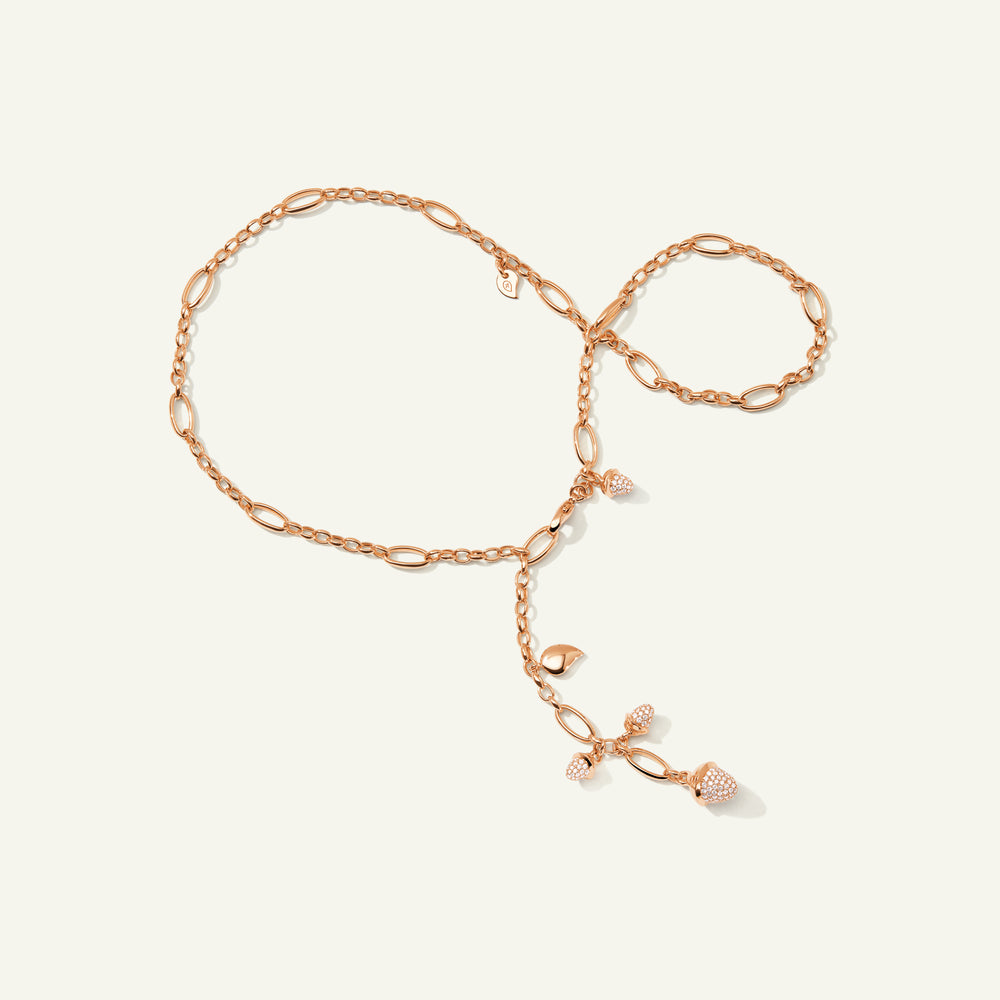 The MIKADO Delicate Necklace features acorn-shaped pendants fully set in sparkling Diamond Pavé. Delicate water drop elements add an elegant touch as they dance along the handcrafted 18K gold chain. The adjustable length makes it a versatile piece for any occasion.