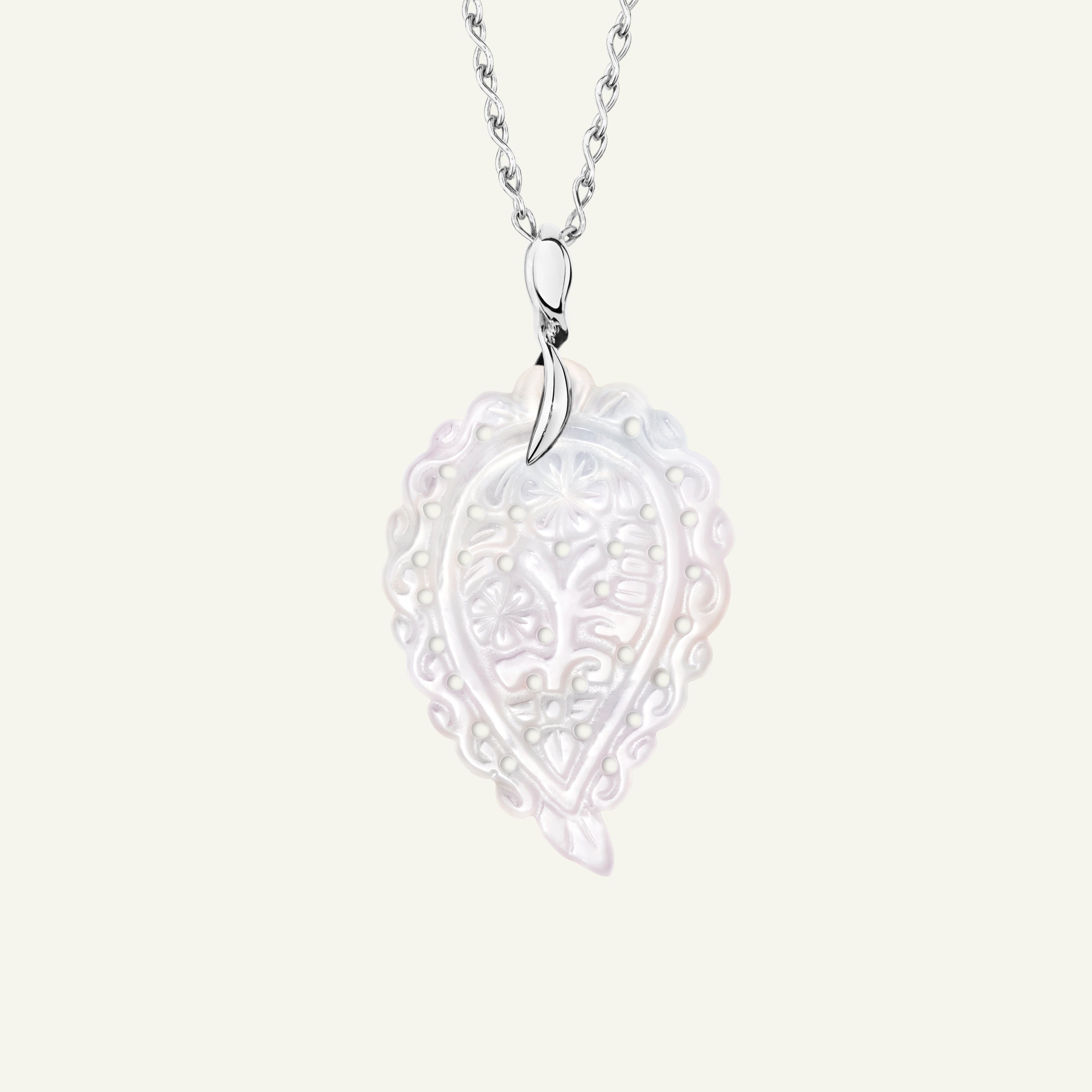 The INDIA Medium Pendant in 18K gold features artfully carved Mother of Pearl, showcasing soft, iridescent tones in an elegant leaf shape. Designed to dangle delicately from a chain, it’s a beautiful everyday favorite that adds a touch of sophistication to any look. Perfect for adding dimension to a layered look.
