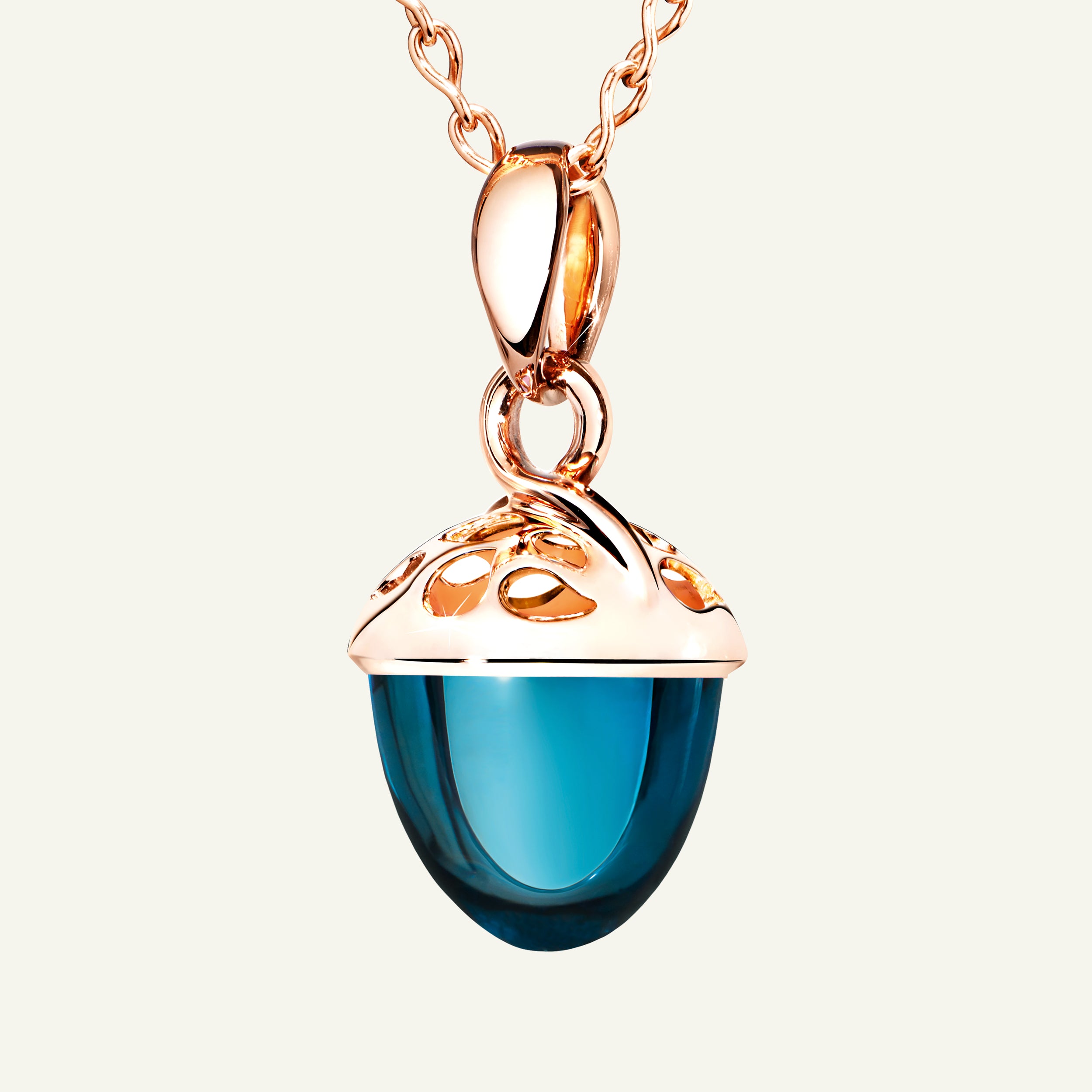The iconic MIKADO Bouquet XL Fairy Pendant with London Topaz features a rich, deep blue gemstone in a large acorn shape, set in 18K gold. The openwork cap design lets light flow through, enhancing the gemstone’s brilliance and revealing even more of its beauty. A graceful detail within the world of MIKADO collectibles, it’s ideal for mix & match styling, collecting, and gifting.