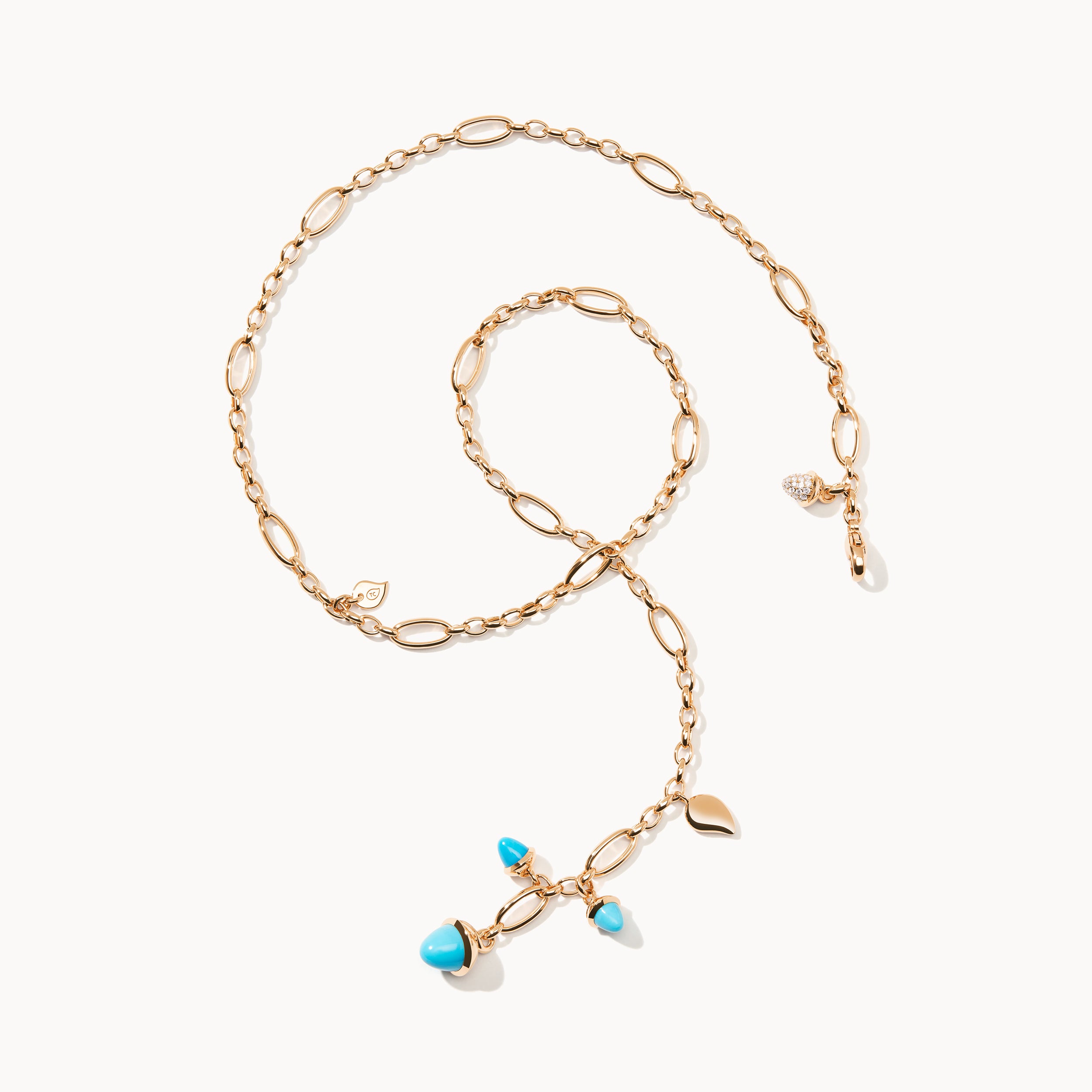 The MIKADO Delicate Necklace in ‘Turquoise’ features acorn-shaped pendants in vibrant blue-green tones. Delicate water drop elements and a sparkling Diamond Pavé pendant dance along the handcrafted 18K gold chain. The adjustable length makes it a versatile piece for any occasion.