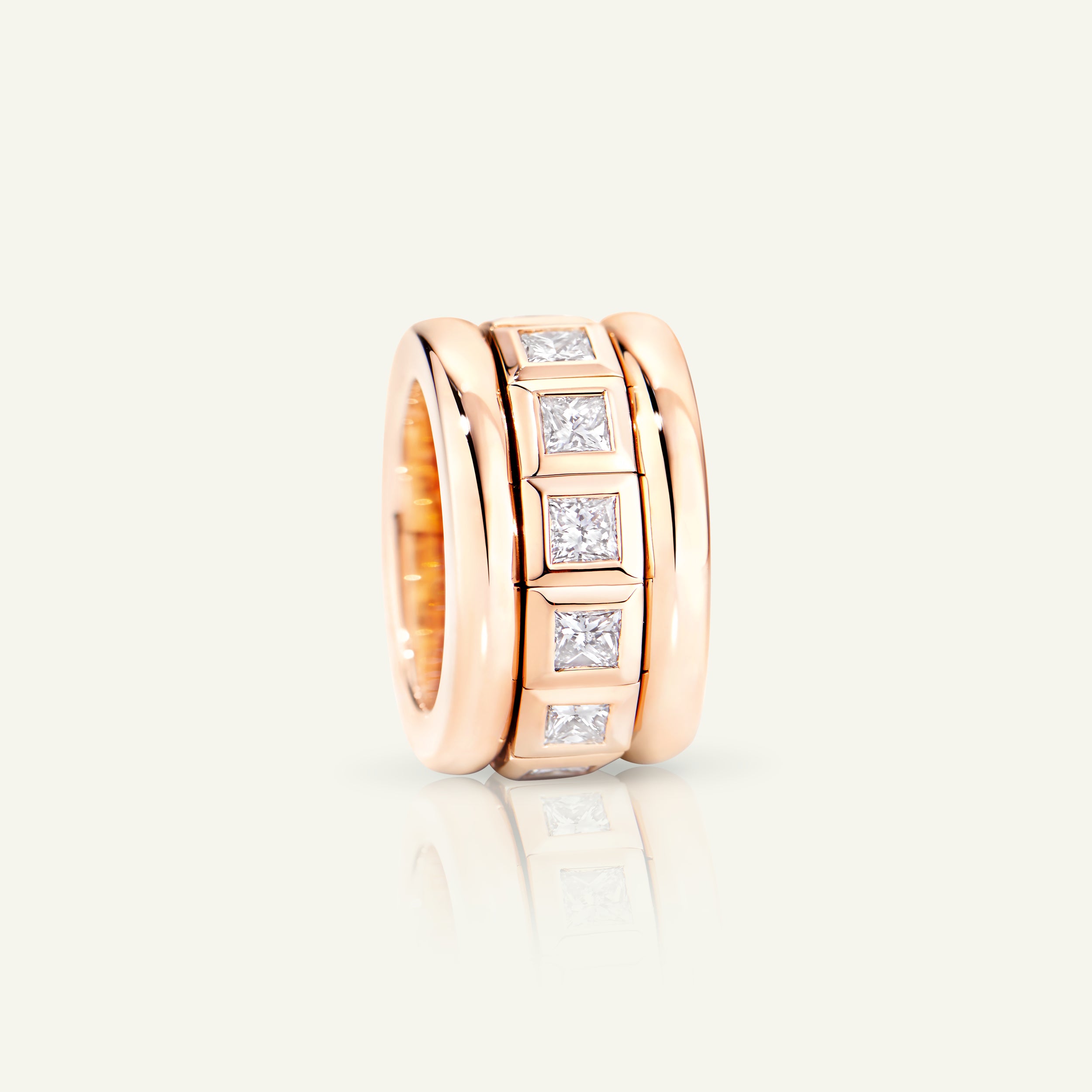 A truly iconic piece, the CURRICULUM VITAE Ring is a masterpiece of modern design. Featuring sliding princess-cut precious stones set in 18K gold, each diamond is meticulously arranged to create sparkle at every angle. Contemporary yet timeless, this exceptional ring embodies pure artistry and elegance.