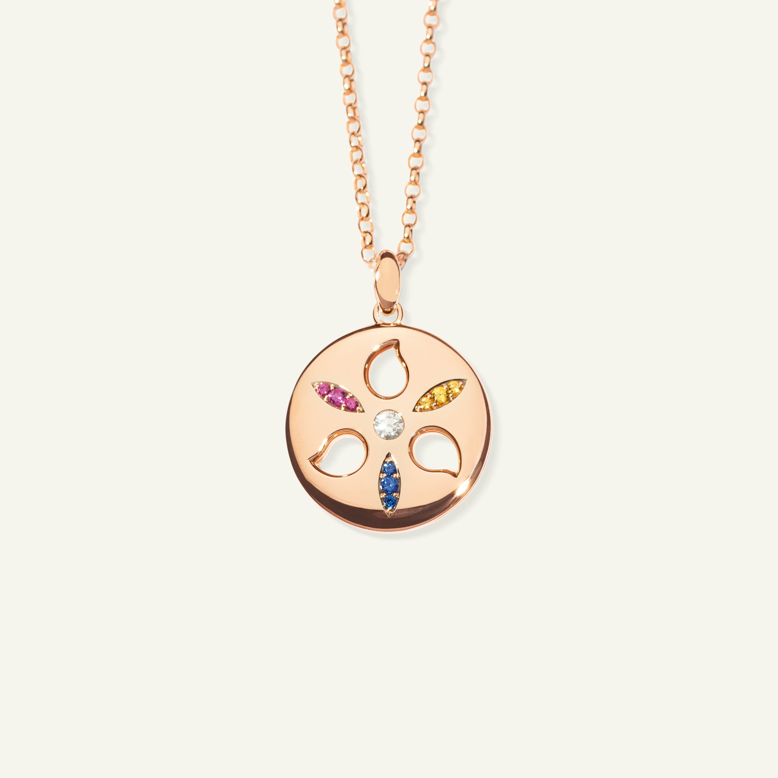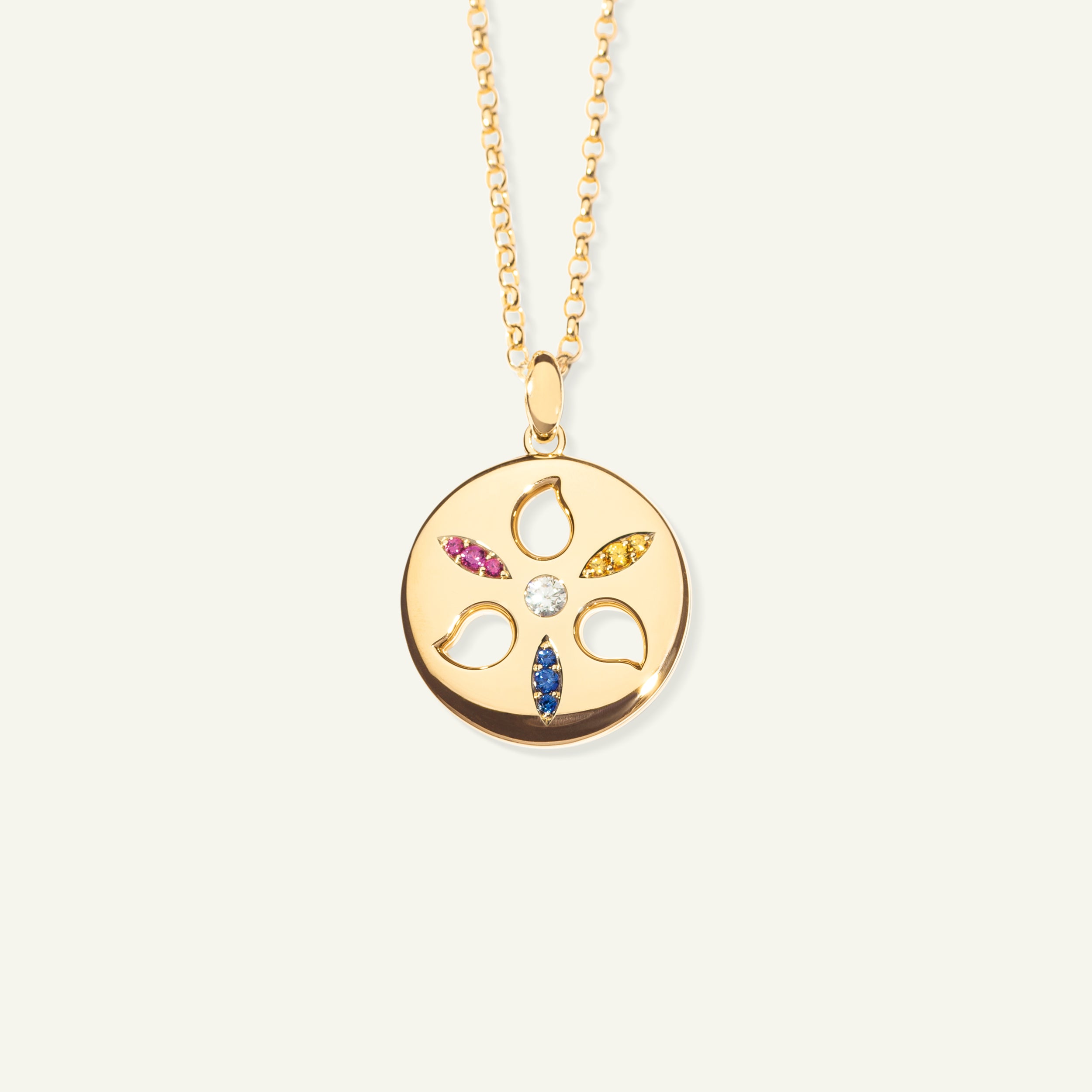 The SAND DOLLAR Large Pendant in ‘Candy’ is inspired by the beauty of the sea urchin shell, symbolizing a deep connection to the ocean. Vibrant sapphires in shades of pink, blue, and yellow surround a sparkling white diamond, all set in 18K gold. Capturing the spirit of the sea, this pendant serves as a unique symbol of casual luxury.