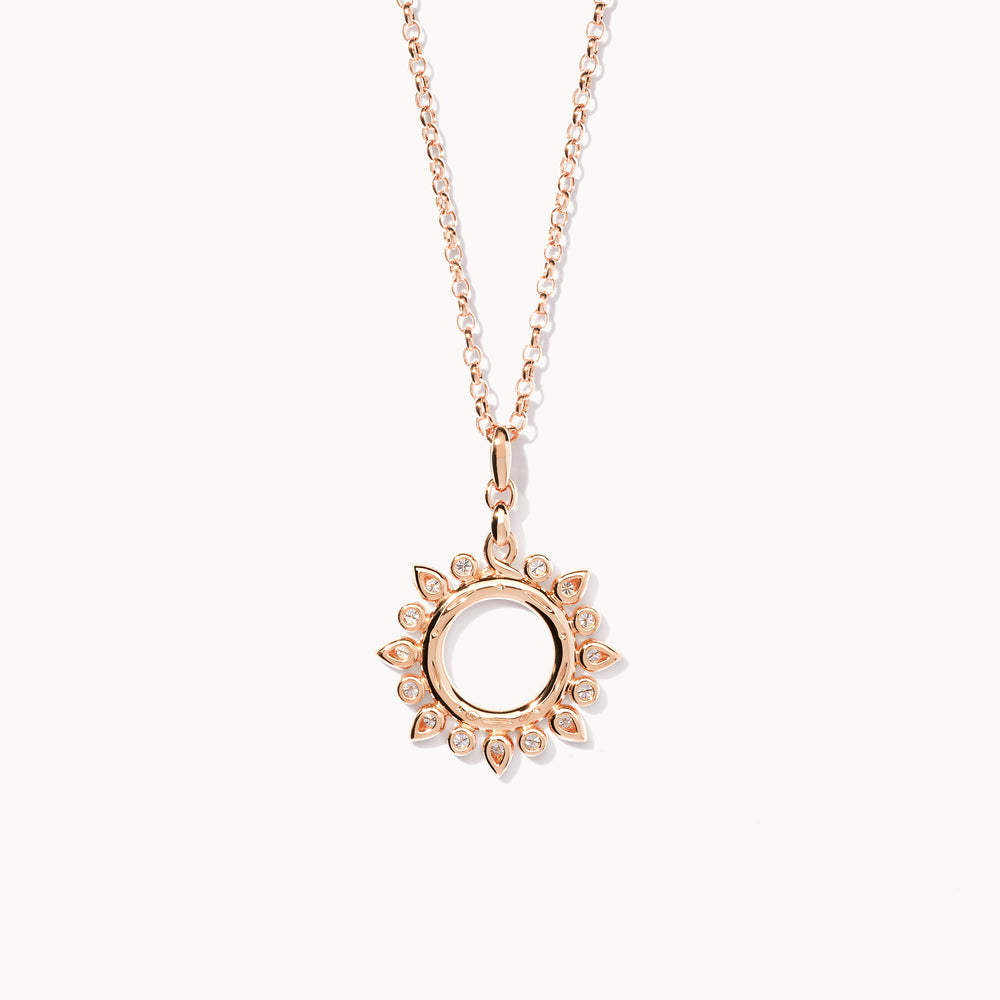 Unser bezaubernder GYPSY Sun Anhänger strahlt als ʿClassicʾ Variante für alle Diamant-Liebhaber. Das Design setzt funkelnde weiße Brillanten, gefasst in 18-karätigem Rosé-, Gelb- oder Weißgold, in Szene. Die tropfenförmigen Sonnenstrahlen nehmen unser unverkennbares Markenzeichen auf charmante Weise auf. Die Sonne strahlt „casual“ an einem Lederband oder klassisch an einer langen Goldkette getragen besonders schön.