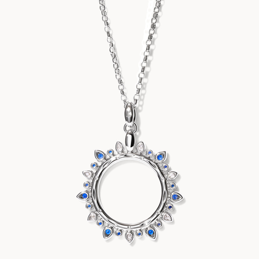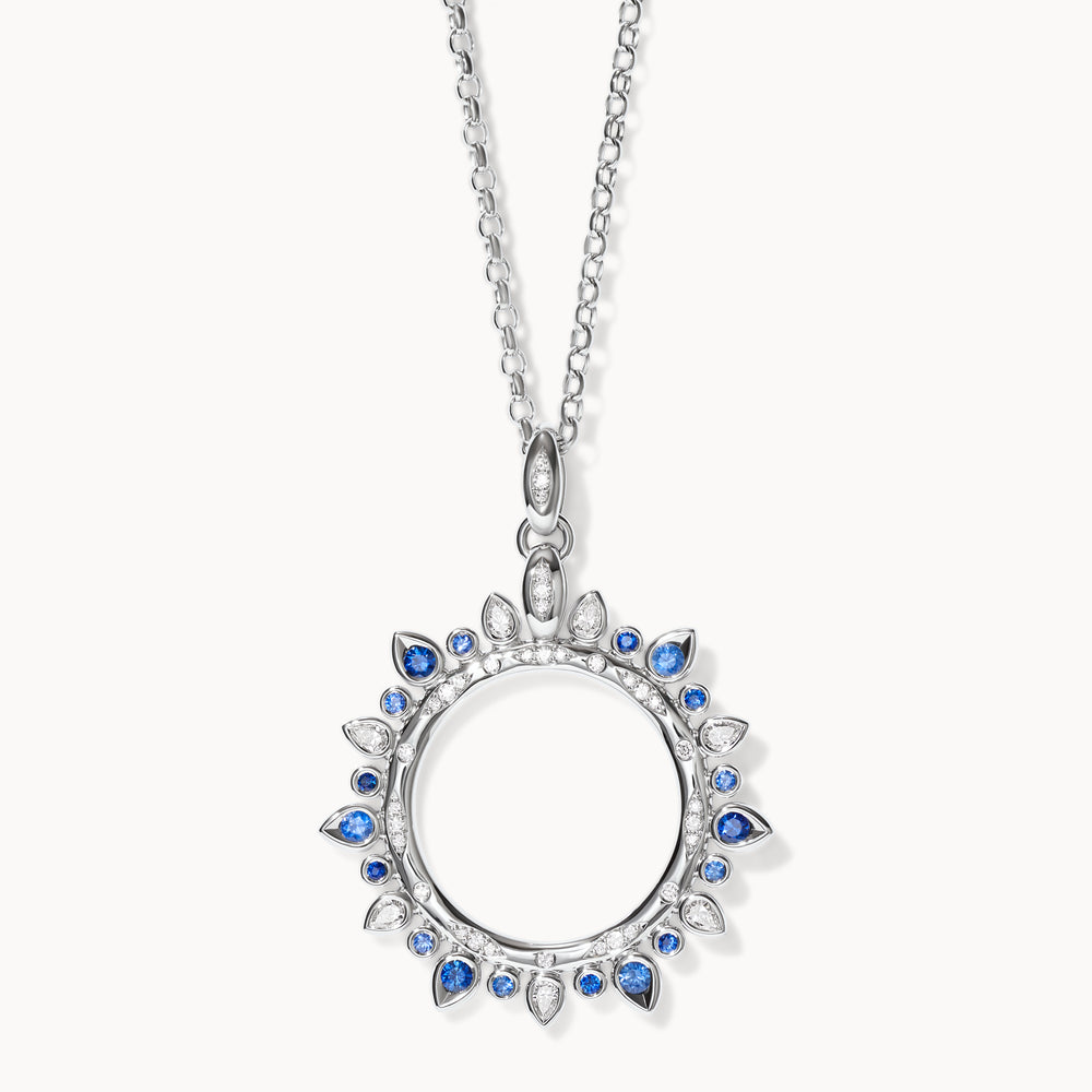 Als besonderes Lieblingsstück der Designerin verkörpert der GYPSY Anhänger Ocean Sun in 18 Karat Weissgold die pure Lebensfreude unserer Marke. Als Symbol für Glückseligkeit und Positivität wird die Sonne spielerisch-elegant in Szene gesetzt. Die farbenfrohen blauen Saphire und funkelnden Diamanten strahlen „casual“ an einem Lederband oder klassisch an einer zarten Goldkette getragen.