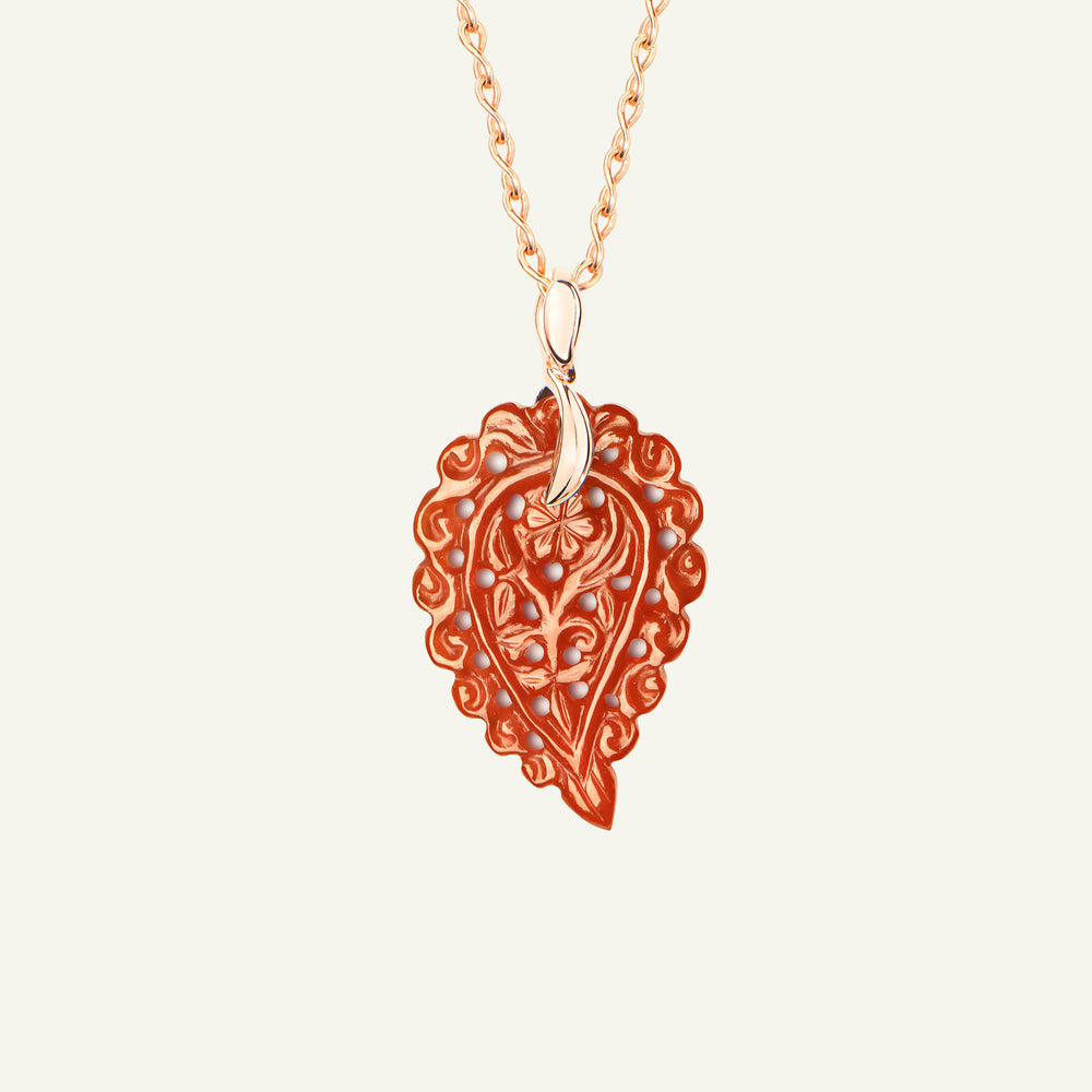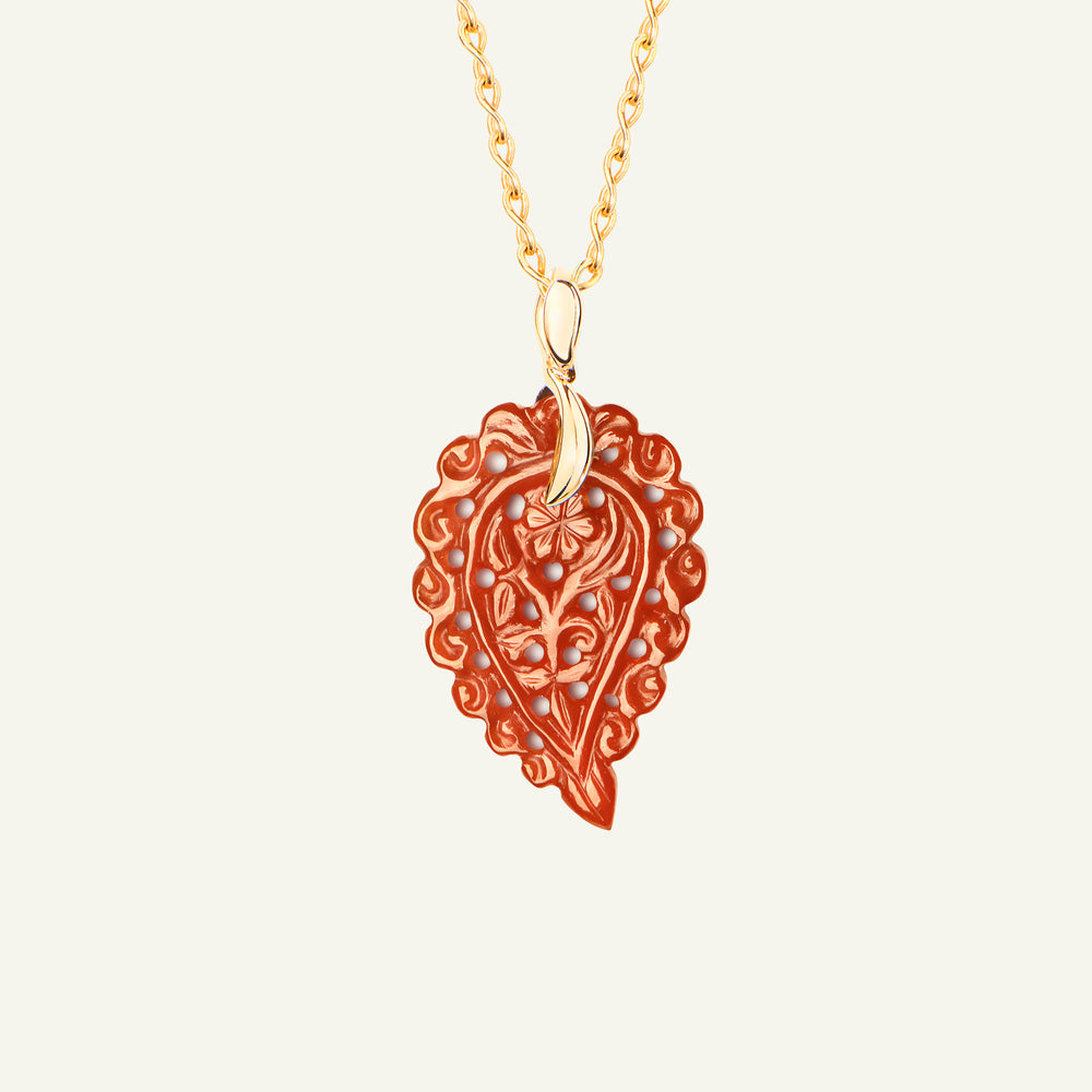 Der INDIA Small Anhänger aus 18 Karat Gold präsentiert kunstvoll geschnitzten Terra Onyx, dessen warme, erdige Brauntöne in einer eleganten Blattform zur Geltung kommen. Für das zarte Schwingen an einer Kette entworfen, ist er ein wunderschöner Alltagsfavorit, der jedem Look einen Hauch von Raffinesse verleiht – perfekt, um einem Layering-Style zusätzliche Dimension zu geben.