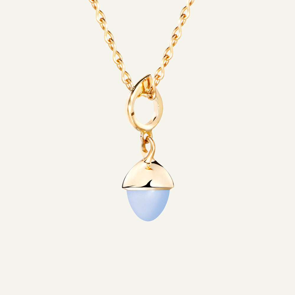 Der ikonische MIKADO Flamenco Anhänger präsentiert einen blauen Chalcedon, der an einem zarten Wassertropfen-Element in 18 Karat Gold hängt. Sein elegantes, zeitloses Design verleiht jeder Schmucksammlung eine besondere Note. Ideal zum Mix & Match, Sammeln und Verschenken.