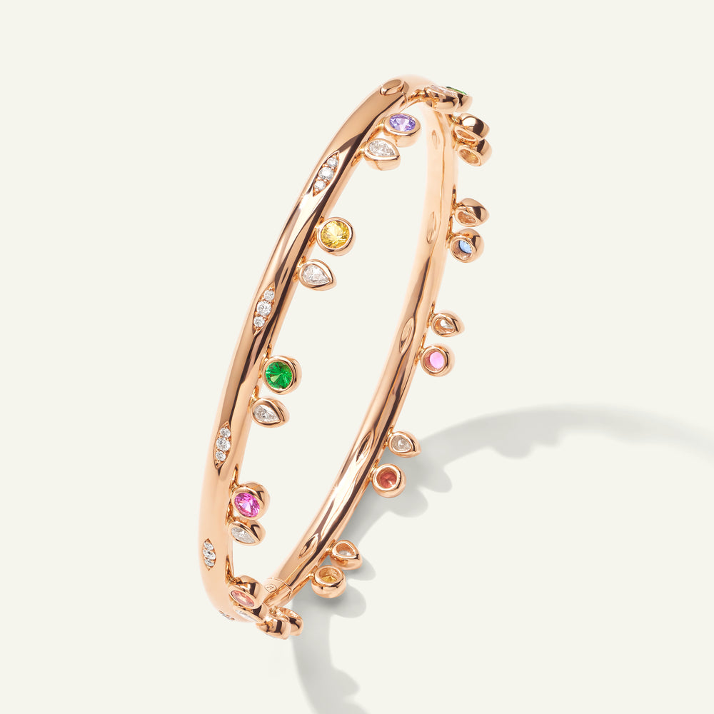 Der GYPSY Armreif aus 18 Karat Gold feiert den verspielten Geist der Color Story 'Candy' mit einer leuchtenden Mischung aus Rosa-, Grün- und Blautönen, akzentuiert durch tropfenförmige Diamanten im Brillantschliff. Erhältlich in vier Größen, kann der Armreif enger anliegend für einen eleganten Look oder eine Nummer größer für einen lässigen Boho-Stil getragen werden. Ein vielseitiges Design, das sich mühelos mit anderen Lieblingsstücken kombinieren lässt.