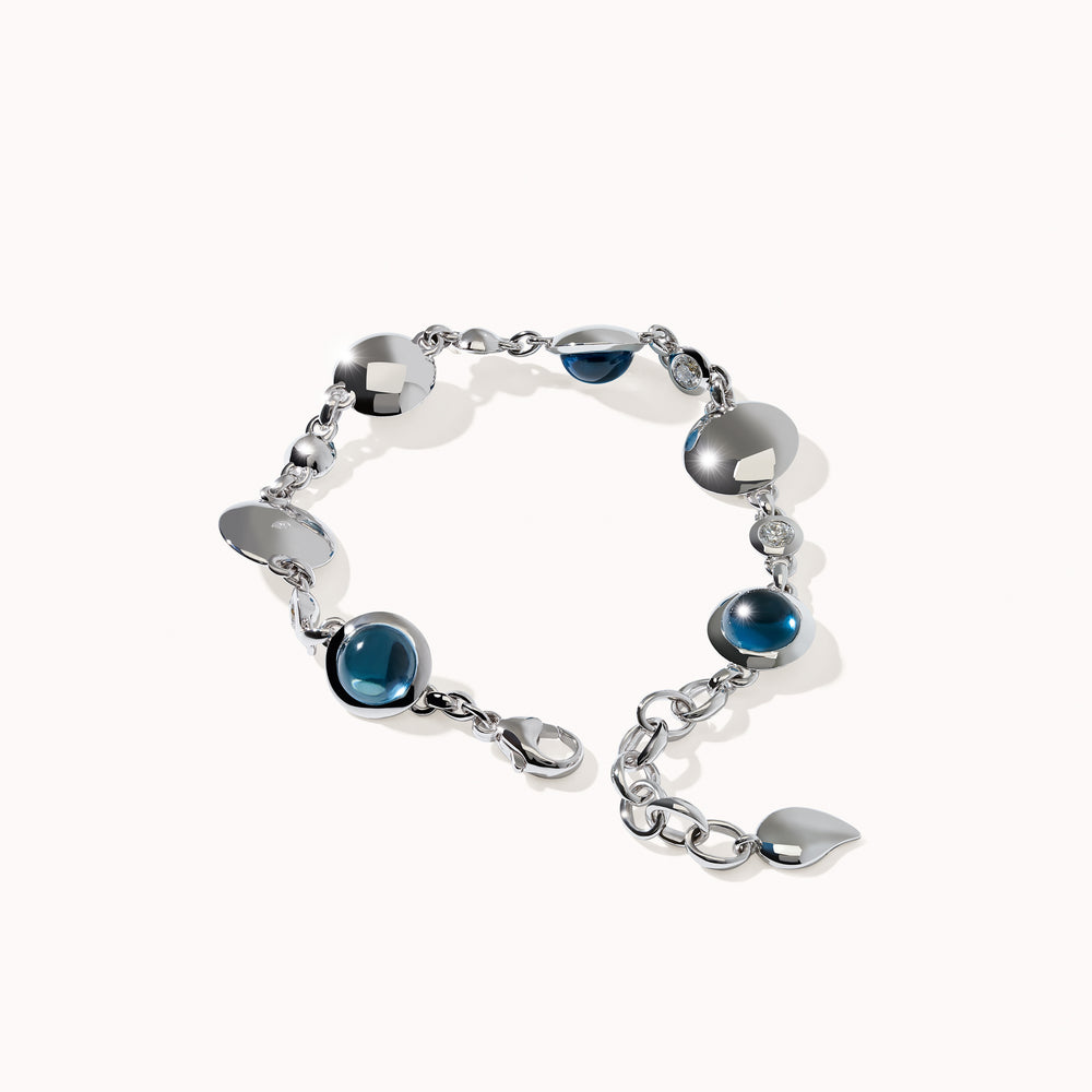 Das BOUTON Armband ist mit strahlend blauem Topas im Cabochon Schliff und Dia...