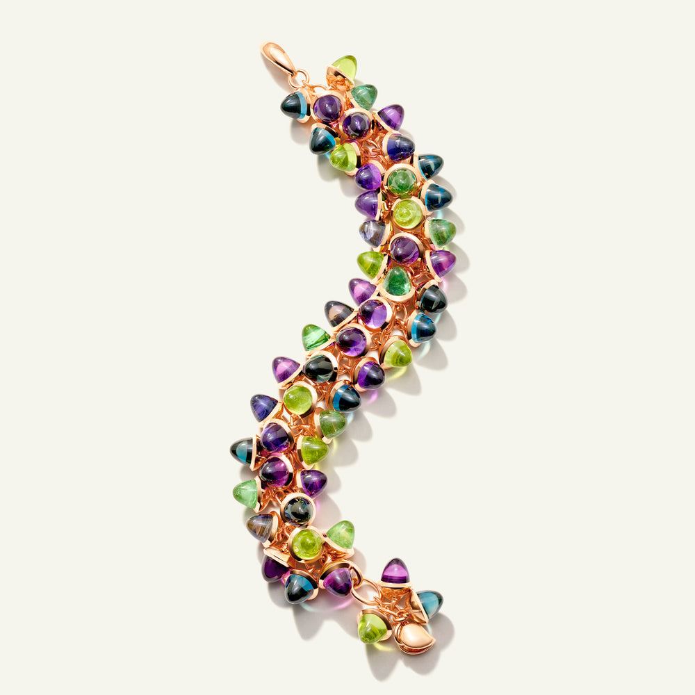 Tauchen Sie ein in eine Welt voller strahlender Farben: Das ikonische MIKADO Flamenco Armband fängt mit 51 kegelförmigen Edelsteinen die Leidenschaft und Energie des Flamenco-Tanzes ein. In aufwendiger Handarbeit aus 18 Karat Gold gefertigt, vereint die Color Story 'Aurora' leuchtende Violett-, Blau- und Grüntöne, die an die wechselnden Farben des Nachthimmels erinnern.