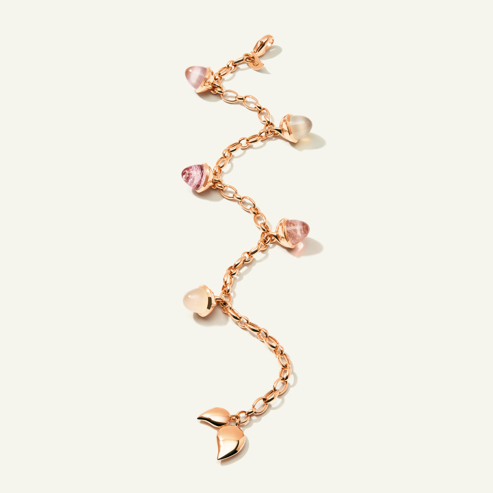Tauchen Sie ein in eine Welt strahlender Schönheit mit dem MIKADO Flamenco Charm Bracelet in der Color Story 'Blush' – eine anmutige Hommage an sanfte, feminine Farbtöne. Fünf kegelförmige Edelsteine und zarte Wassertropfen-Elemente, inspiriert von der Leidenschaft und Energie des Flamenco-Tanzes, funkeln an einer handgefertigten 18K-Goldkette. Ein Design, das jedem Look Saison für Saison einen Hauch von Romantik und zeitloser Schönheit verleiht.