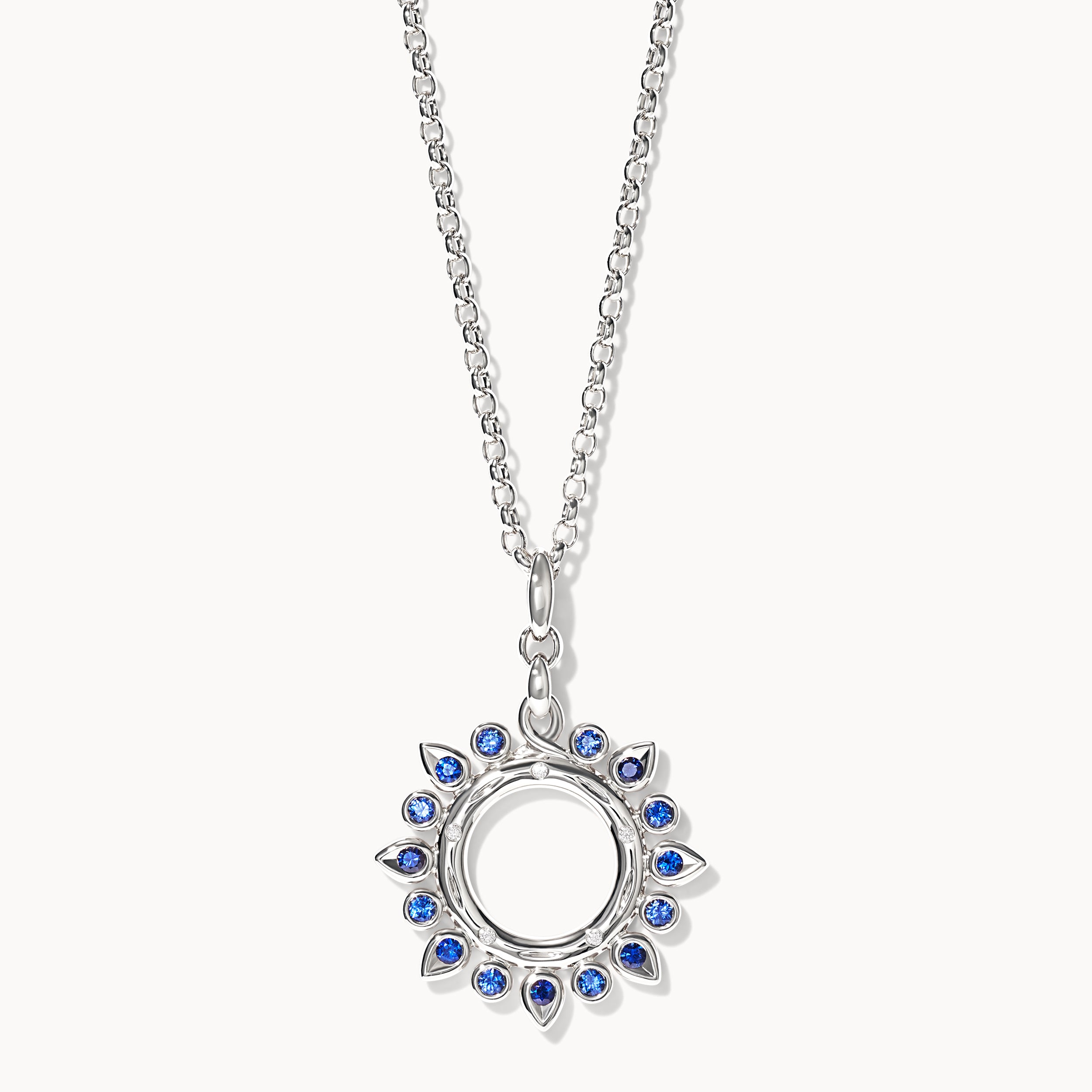 Als besonderes Lieblingsstück der Designerin verkörpert der GYPSY Anhänger Ocean Sun in 18 Karat Weissgold die pure Lebensfreude unserer Marke. Als Symbol für Glückseligkeit und Positivität wird die Sonne spielerisch-elegant in Szene gesetzt. Die farbenfrohen blauen Saphire und funkelnden Diamanten strahlen „casual“ an einem Lederband oder klassisch an einer zarten Goldkette getragen.