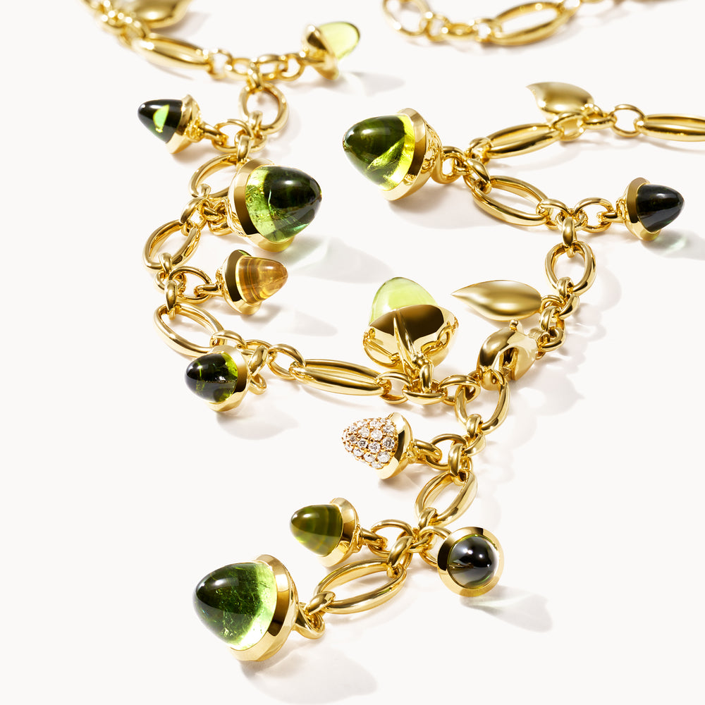 Setzen Sie ein Statement mit der MIKADO Halskette in 'Rainforest', die vielseitige Styling-Möglichkeiten für jeden Anlass bietet. Ein funkelnder Wasserfall aus leuchtenden grünen Edelsteinen erstrahlt an einer handgefertigten Kette aus 18 Karat Gold. Akzente aus Diamant Pavé und zarten Wassertropfen verleihen zusätzlichen Glanz. Lässig am Tag, elegant am Abend.