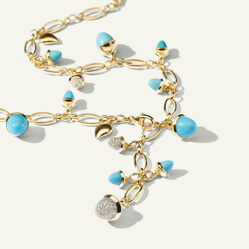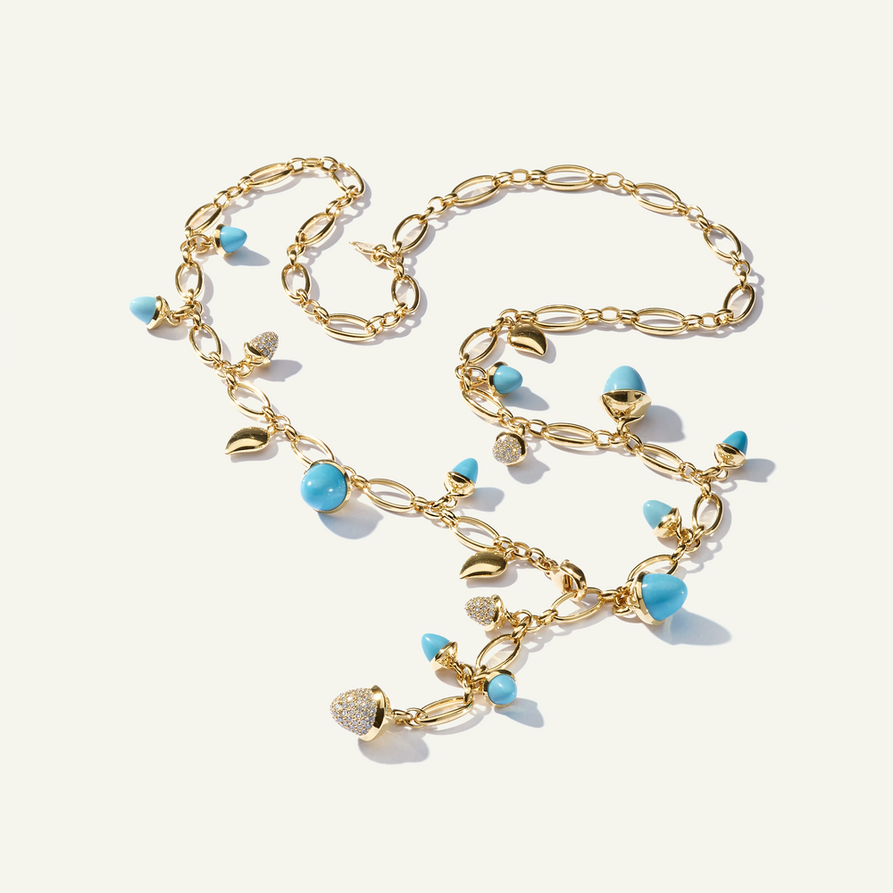 Setzen Sie ein Statement mit der MIKADO Halskette in 'Turqoise', die vielseitige Styling-Möglichkeiten für jeden Anlass bietet. Ein funkelnder Wasserfall aus blau-grünen Edelsteinen erstrahlt an einer handgefertigten Kette aus 18 Karat Gold. Akzente aus Diamant Pavé und zarten Wassertropfen verleihen zusätzlichen Glanz. Lässig am Tag, elegant am Abend.