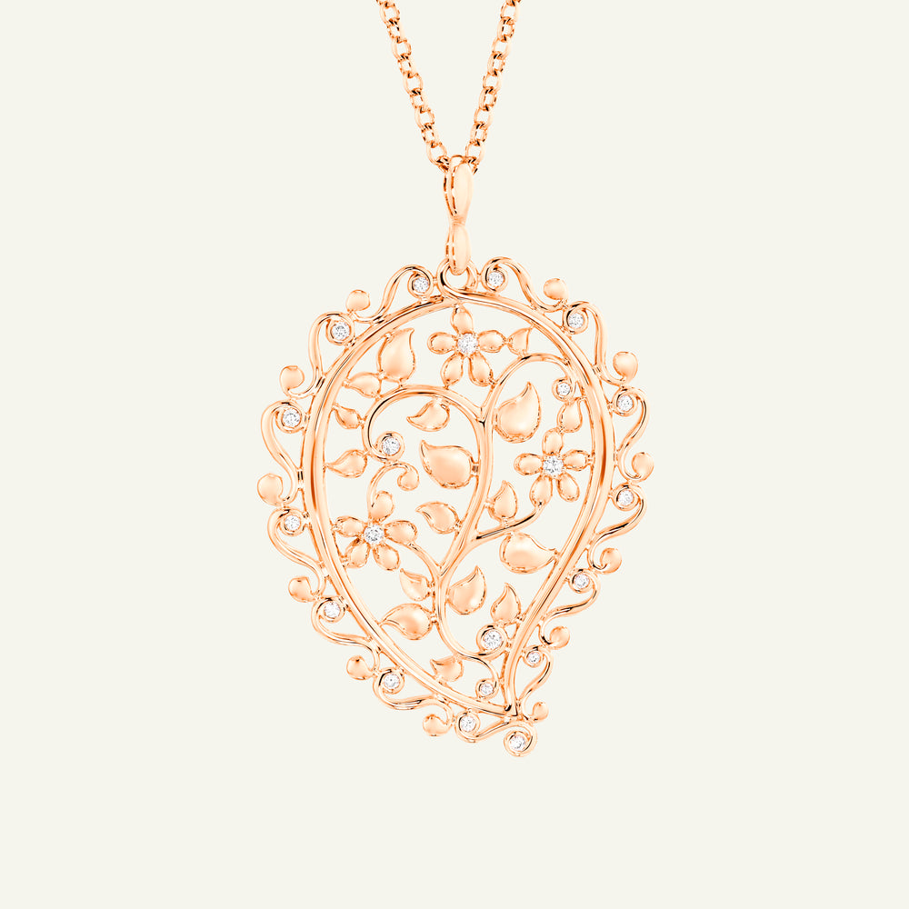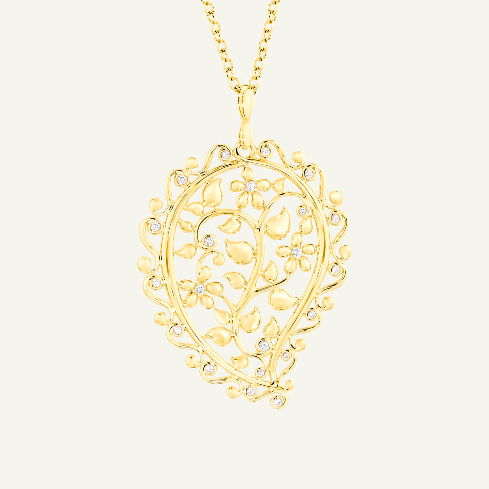 Der INDIA Dream Anhänger aus 18 Karat Gold schimmert mit funkelnden Diamanten in einem kunstvollen, handgefertigten Design. Inspiriert von indischen Wandmalereien und kunstvoll bestickten Seidenstoffen ist dieser detailreiche Anhänger ein strahlendes Centerpiece, das jedem Look zeitlosen Glanz und Ausdruck verleiht.