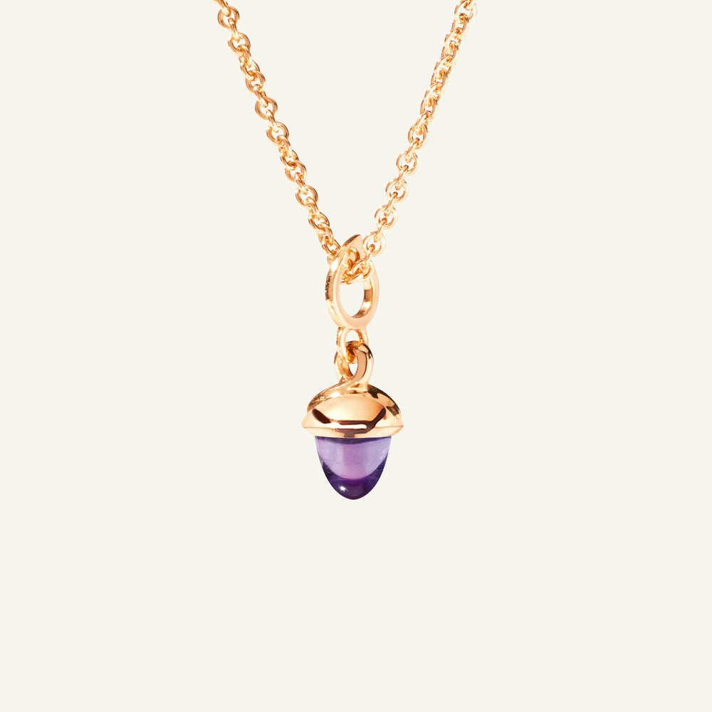 Der miniMIKADO Anhänger präsentiert einen leuchtend violetten Amethyst in der charakteristischen kegelförmigen Form und charmant-zierlicher Größe, gefasst in 18 Karat Gold. Vielseitig tragbar, kann der miniMIKADO Anhänger an einer feinen Kette getragen oder mit weiteren MIKADO Anhängern kombiniert werden. Ideal zum Mix & Match, Sammeln und Verschenken.