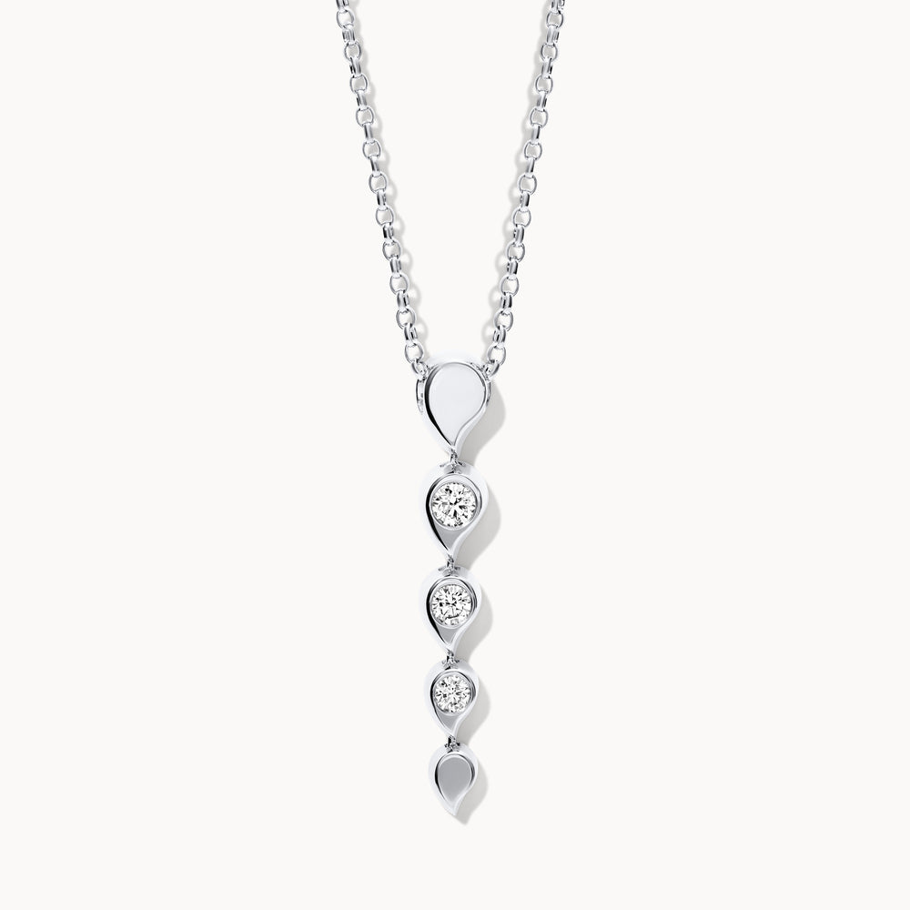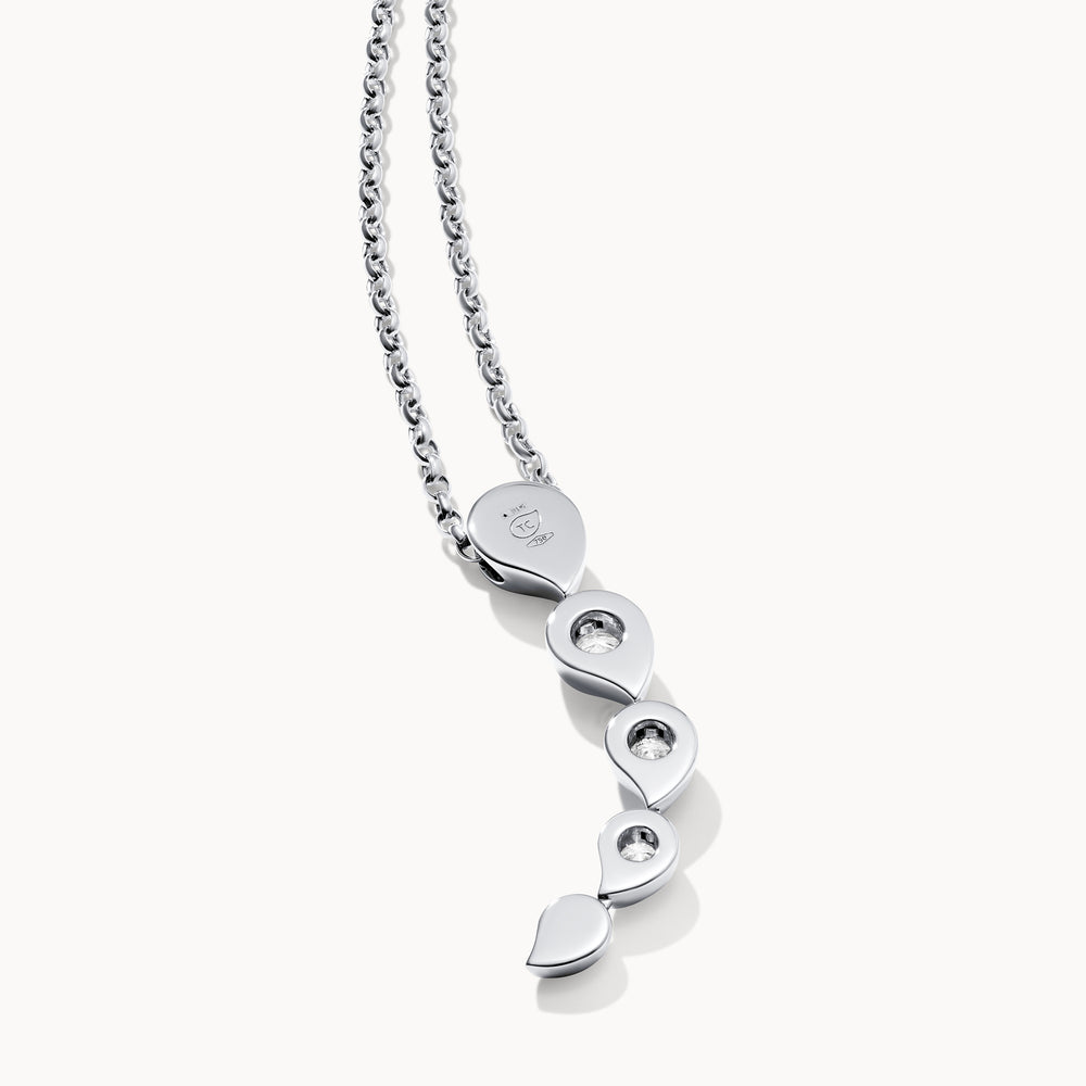 Unser Rivière-Anhänger ist eine zarte Ergänzung der beliebten SNOWFLAKES-Kollektion und hat einen eleganten und verspielten Look. Mit einer raffinierten Reihe weißer Diamanten, die in Form von Wassertropfen gefasst sind, lässt der Anhänger sanfte Bewegungen zwischen den einzelnen Fassungen zu, die das Gefühl von fließendem Wasser vermitteln. Er sitzt wunderschön knapp unterhalb des Halses, und kann sowohl einzeln als auch im layering look getragen werden.