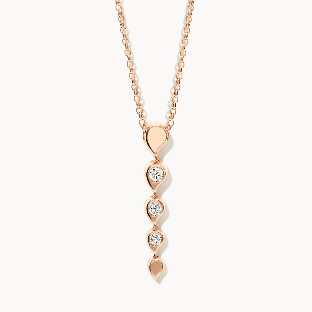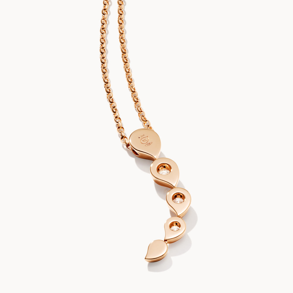 Unser Rivière-Anhänger ist eine zarte Ergänzung der beliebten SNOWFLAKES-Kollektion und hat einen eleganten und verspielten Look. Mit einer raffinierten Reihe weißer Diamanten, die in Form von Wassertropfen gefasst sind, lässt der Anhänger sanfte Bewegungen zwischen den einzelnen Fassungen zu, die das Gefühl von fließendem Wasser vermitteln. Er sitzt wunderschön knapp unterhalb des Halses, und kann sowohl einzeln als auch im layering look getragen werden.