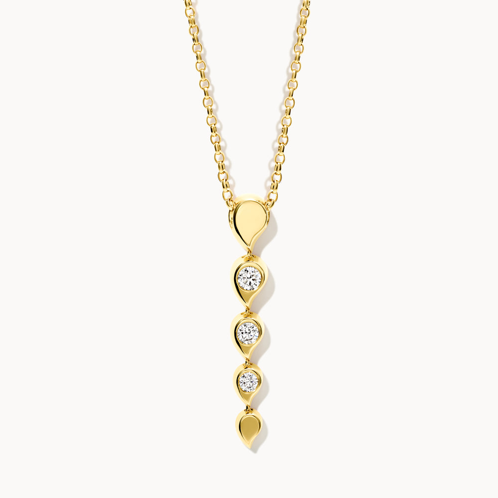 Unser Rivière-Anhänger ist eine zarte Ergänzung der beliebten SNOWFLAKES-Kollektion und hat einen eleganten und verspielten Look. Mit einer raffinierten Reihe weißer Diamanten, die in Form von Wassertropfen gefasst sind, lässt der Anhänger sanfte Bewegungen zwischen den einzelnen Fassungen zu, die das Gefühl von fließendem Wasser vermitteln. Er sitzt wunderschön knapp unterhalb des Halses, und kann sowohl einzeln als auch im layering look getragen werden.